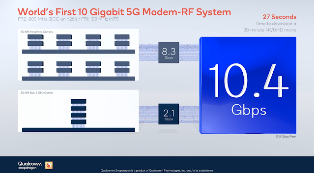 Qualcomm в рамках MWC2021 представил ряд демонстраций, чтобы наглядно проиллюстрировать возможности модема X65. В частности, рекорд скорости, который можно получить с помощью этого модема за счет агрегации частотных полос mmWave и sub6.