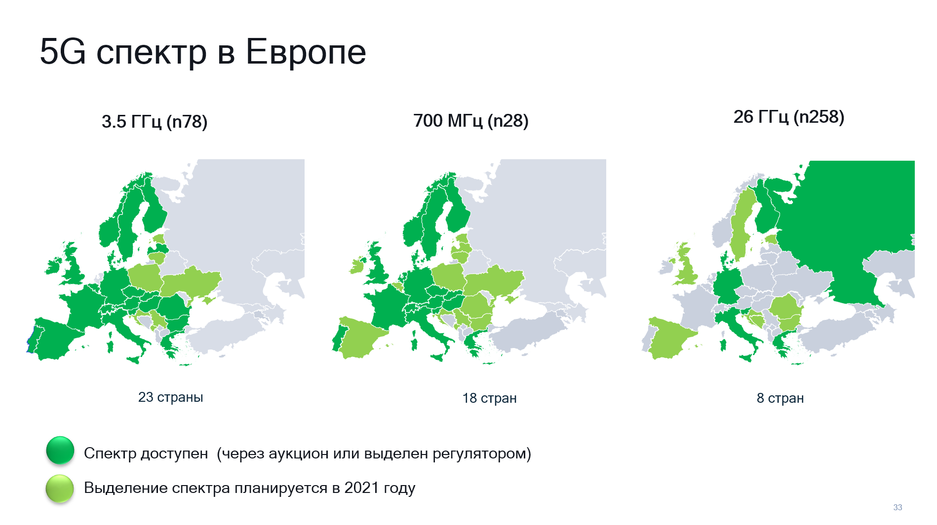 Есть группа стран, где выделение частот mmWave 26ГГц планируется в конце 2021 – в 2022 году. Это такие страны, как Франция, Румыния, Болгария, Ирландия, Австрия, Польша, Норвегия, Словакия, Чехия.