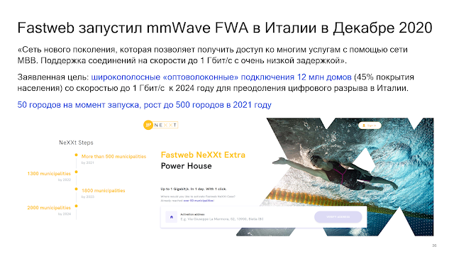 У Fastweb не было своей сети LTE, этот оператор взял частоты band 42 в аренду у других операторов и запустил услугу FWA с использованием 5G mmWave и band 42, как опорного диапазона LTE. Еще поговорим об этом кейсе, обсуждая следующий слайд.
