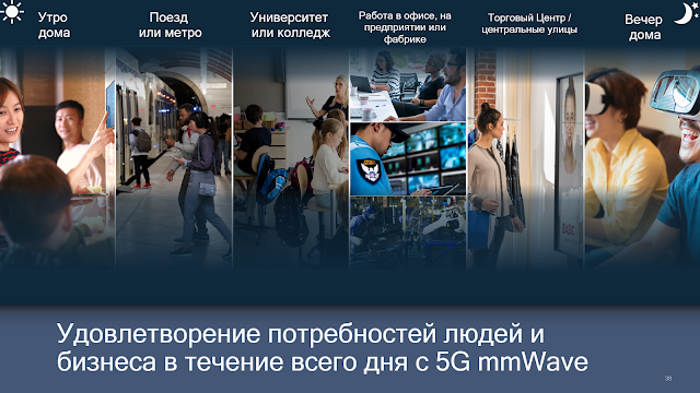 Хотелось бы привлечь ваше внимание к этому слайду. Работая с операторами, мы стараемся продумать, как добиться того, чтобы человек в течение всего дня мог находиться в зоне покрытия гигабитных сетей 5G mmWave. Утром – дома, затем в поезде или в метро, затем на учебе или на работе, в торговом центре и на центральных улицах города, а затем дома.