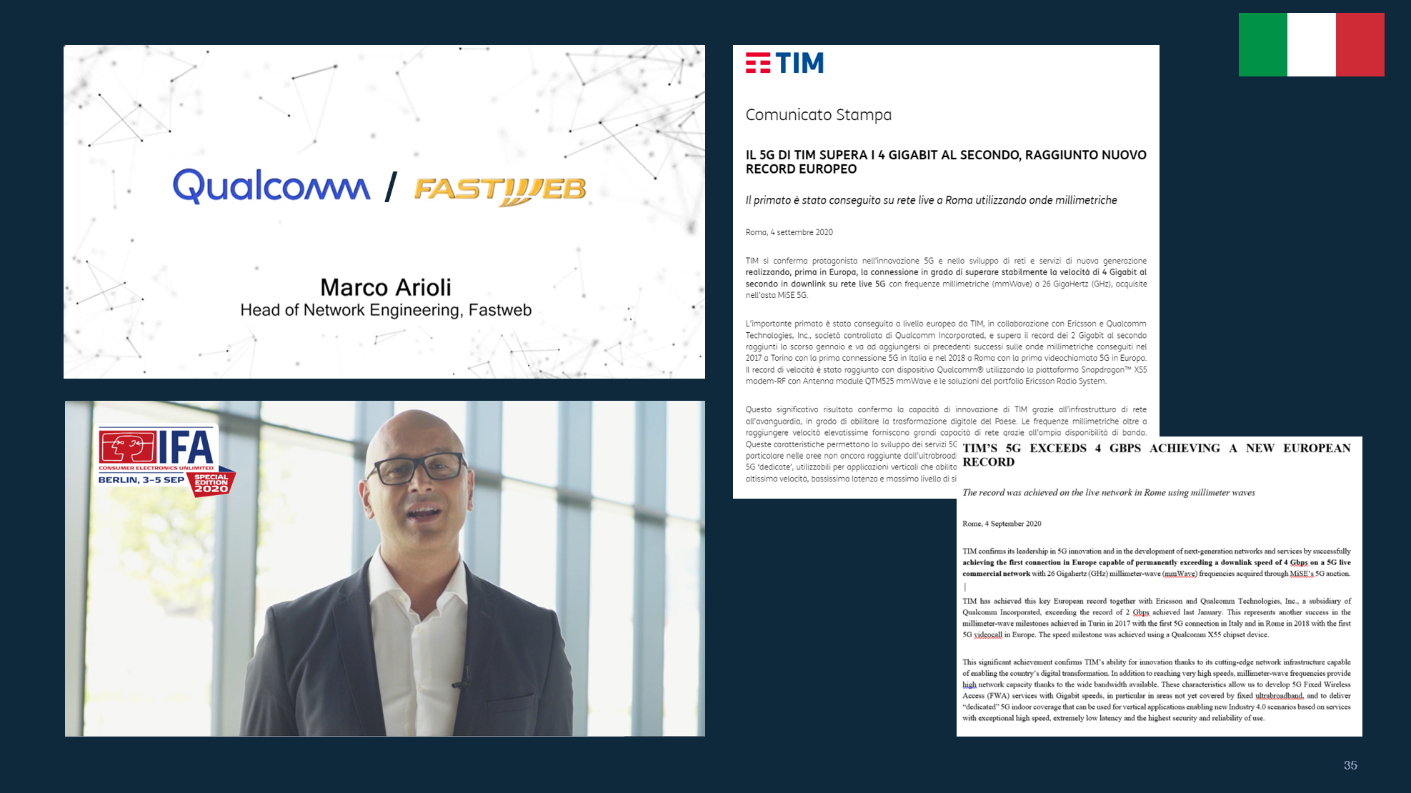 Если говорить о текущем прогрессе в Европе, то сейчас одним из активных 5G операторов, продвигающих mmWave, является итальянская компания Fastweb. Этот оператор уже предоставляет услуги 5G NSA mmWave FWA в режиме коммерческой доступности с декабря 2020 года. Marco Arioli - руководитель проекта по развертыванию сети 5G mmWave в Fastweb.