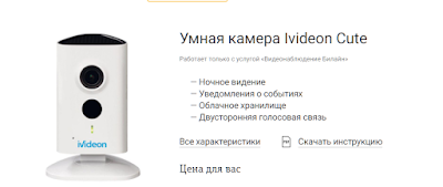 Камеру ivideon Cute можно купить, например, в Билайн (на сайте или собственном офисе компании) - за 3990 руб. оплатив ее целиком или в рассрочку. Абонентская плата составляет 300 рублей в месяц с сохранением архива записей зафиксированных событий (движение в кадре, звуки) за 7 дней, либо, если если хочется иметь постоянный архив непрерывной видеозаписи (длиной 7 суток), то цена услуги вырастет до 350 рублей в месяц.