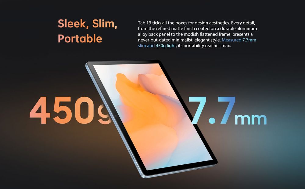 Толщина Blackview Tab 13 – 7,7 мм, материал корпуса – алюминий.