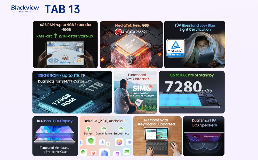 В части коммуникационных возможностей поддерживается как Wi-Fi, так и 4G, причем SIM-карт может быть две. Для расширения встроенной памяти можно использовать карты microSD объемом до 1 Тб. Купить Blackview Tab 13 можно с 22 августа.