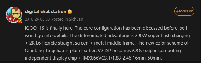Новинка получит быструю зарядку мощностью 200 Вт, металлический каркас и кожаную заднюю панель. Также в iQOO 11 будет встроен ISP-чип Vivo V2, который будет помогать камере и дисплею. Для основной камеры будет использоваться датчик Sony IMX866VSC, а также 2 вспомогательных сенсора. Разрешение фронтальной камеры составит 16 Мп.