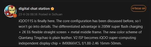 Типстер DCS заполнил пробелы в спецификациях, сообщив, что iQOO 11S будет оснащен 6,78-дюймовым AMOLED-дисплеем E6 с разрешением 2K и частотой обновления 144 Гц. В данном случае гибкий дисплей используется для достижения симметричных рамок вокруг экрана.