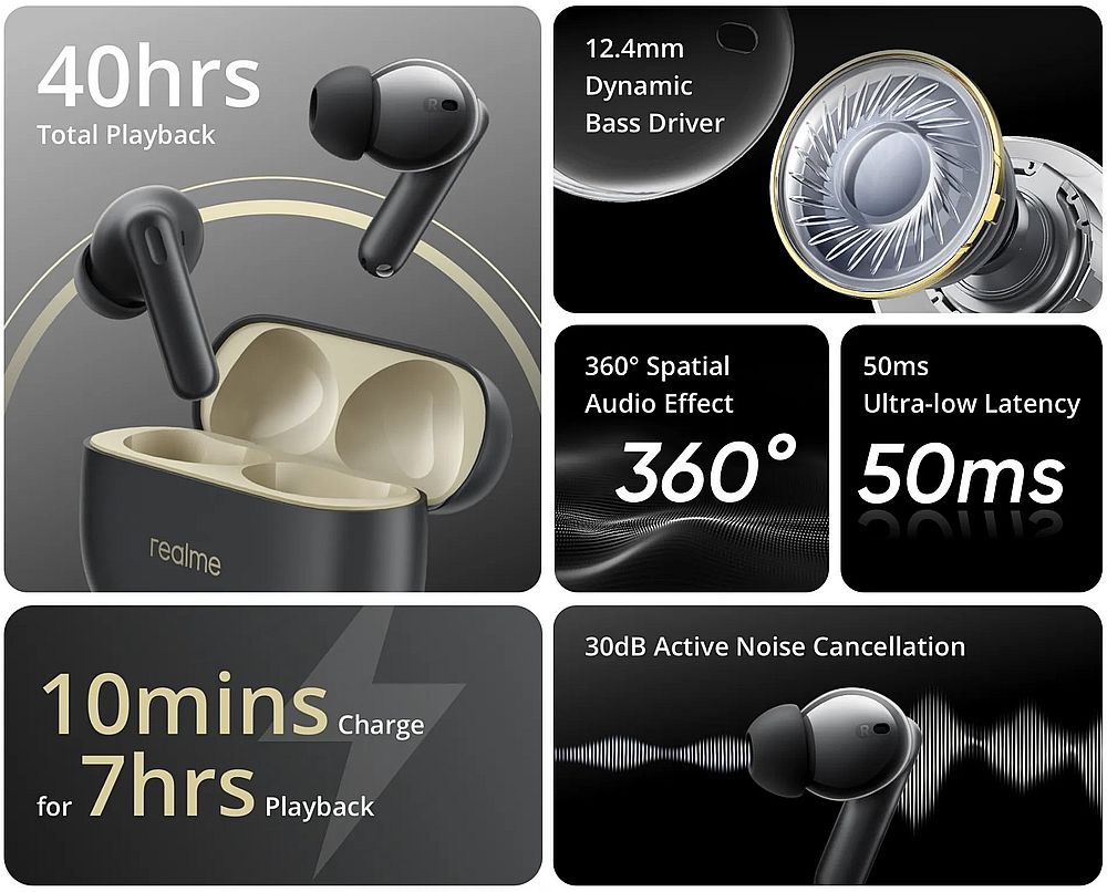Realme Buds T300 рекламируются с пространственным аудиоэффектом на 360°, задержкой 50 мс и возможностью подключения Bluetooth 5.3. Наушники также поддерживают Dolby Atmos и сертифицированы в части защиты от влаги и пыли по стандарту IP55.