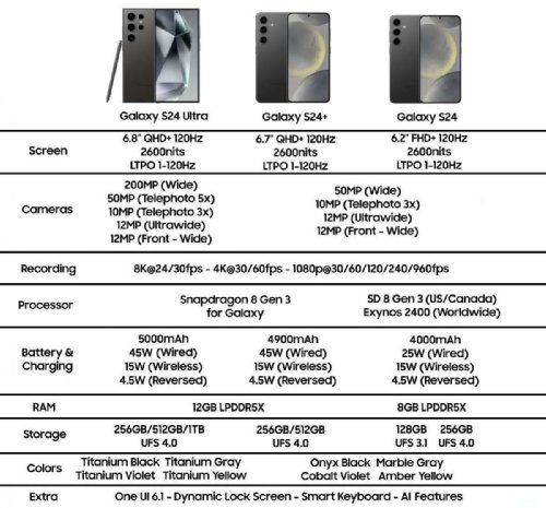Samsung представила смартфоны серии Galaxy S24. В серию вошли 3 устройства: Galaxy S24, Galaxy S24 Plus и Galaxy S24 Ultra, который стал флагманом линейки.