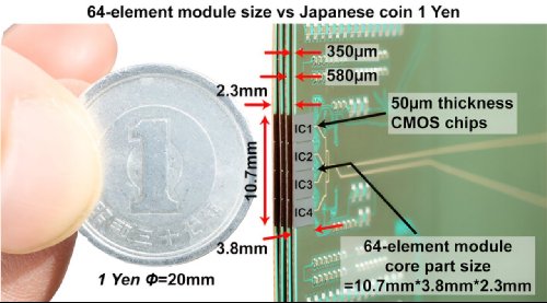 Компактный передатчик с фазированной решеткой и встроенными антеннами. Благодаря выбранной топологии и компоновке схемы, предлагаемые микросхемы передатчиков могут быть объединены в массив из 64 элементов, занимающий минимальный объем. Источник: Токийский технологический институт