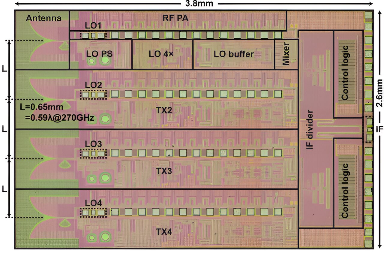 Ученые из Tokyo Tech разработали конструкцию передатчика с фазированной решеткой для диапазона 300 ГГц. Об этом сегодня сообщает techxplore. Особенность разработки - эффективное использование площади, низкое энергопотребление и высокая скорость передачи данных. Такие особенности могут позволить создать на его основе различные технологические приложения, включая возможности "просвечивания" человеческого тела, радаров, беспроводной связи 6G, различных датчиков.