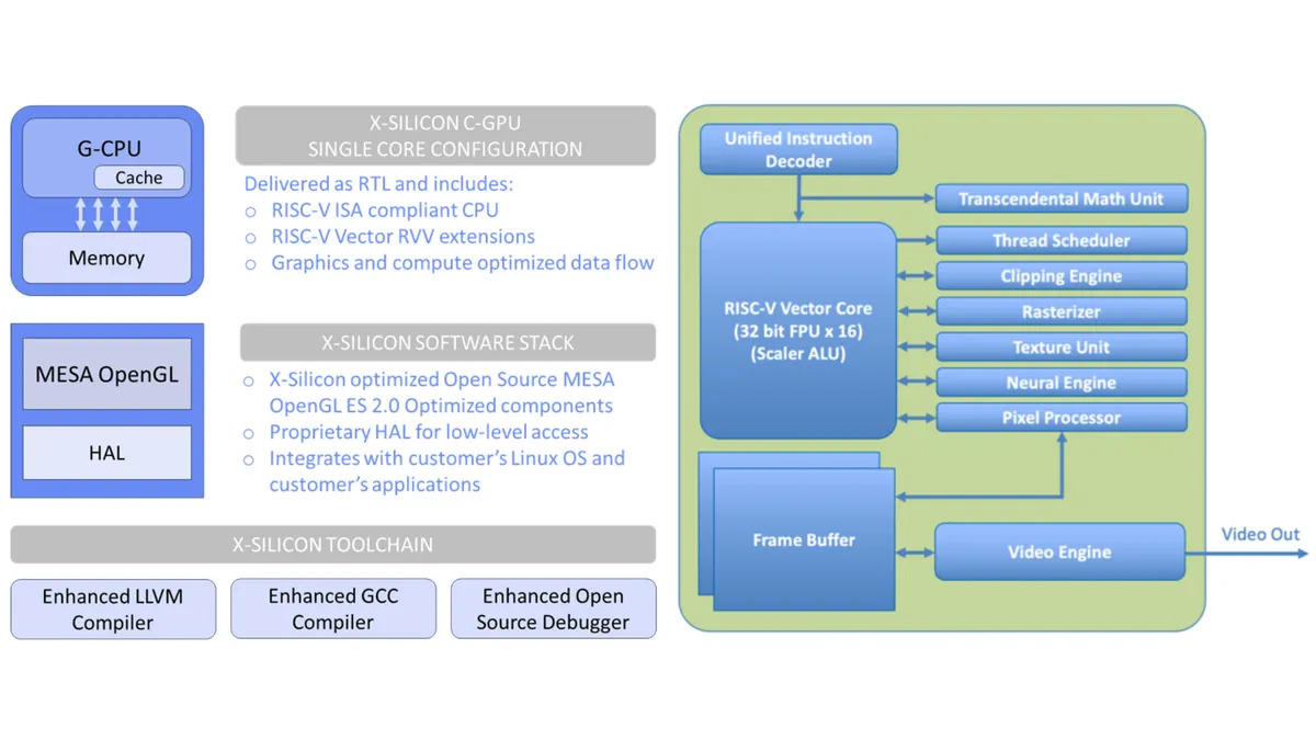 В чипе реализована архитектура C-GPU X-Silicon, которая объединяет функции ускорителя с векторным ядром процессора RISC-V. Процессор построен на основе векторного ядра RISC-V с 32-битным FPU и ALU Scaler. Поддерживается планировщик потоков, механизм обрезки (Clipping Engine), растеризатор, блок обработки текстур, нейронный движок и пиксельный процессор. Чип предназначен для работы с приложениями, включая ИИ, HPC (высокопроизводительные вычисления), геометрические вычисления, а также поддержку 2D- и 3D-графики.