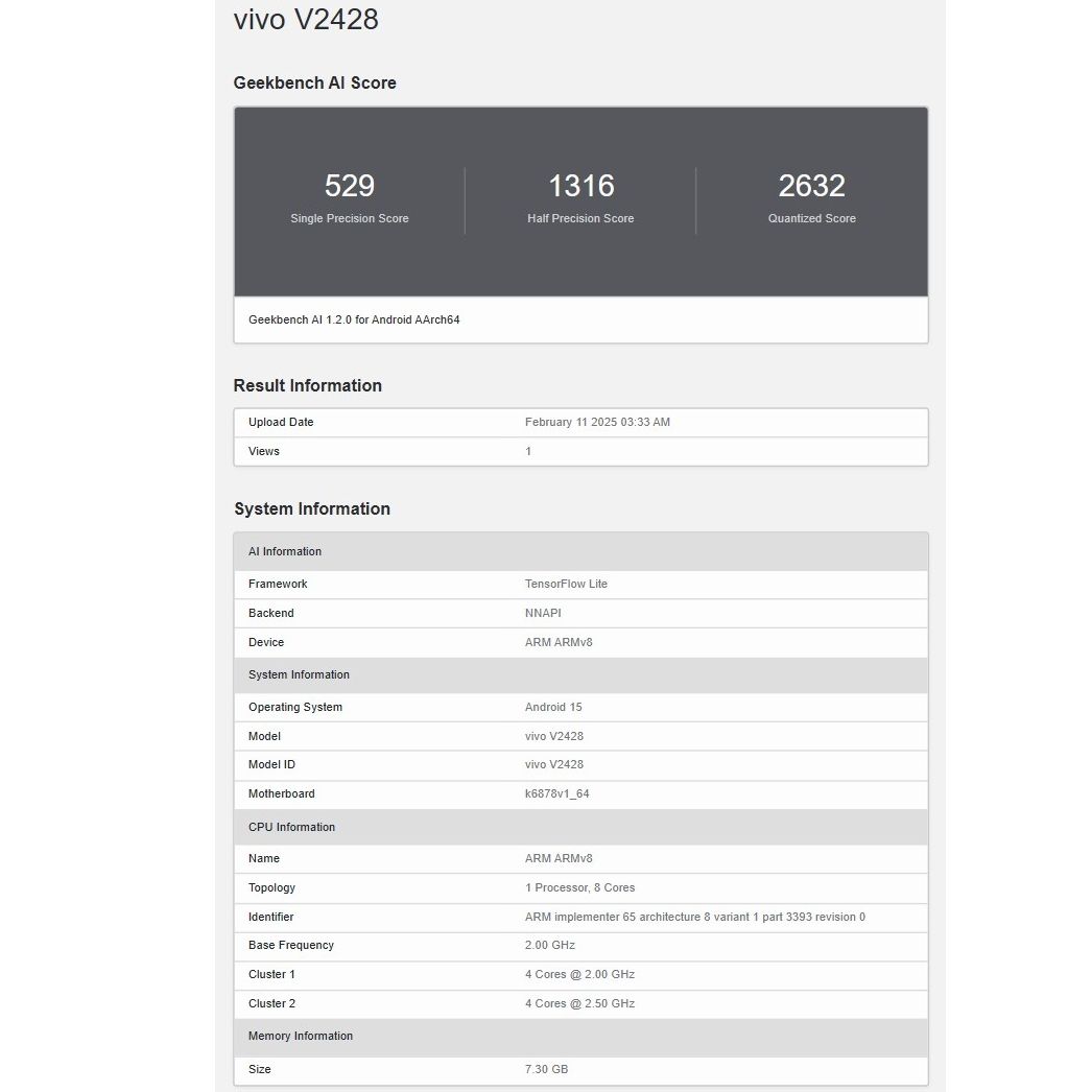 Vivo V50e с номером модели V2428 замечен в базе данных Geekbench AI. Благодаря тесту стало известно, что V50e будет основан на MediaTek Dimensity 7300 SoC. Напомню, этот же чипсет использовался в предшественнике этой модели – V40e, выпущенном несколько месяцев назад. По итогам теста прототип V50e набрал 529 баллов Single Precision Score в Geekbench AI, 1316 баллов Half Precision Score и 2632 балла Quantized Score.