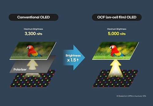 В новой OLED-панели используется технология On-Cell Film (OCF), инновация Samsung, которая устраняет необходимость в поляризаторе. По сообщениям, поляризаторы, традиционно используемые для блокировки окружающего света, снижают яркость OLED до 50%. Удалив поляризатор, Samsung добилась того, что дисплей не только ярче, но и энергоэффективнее.