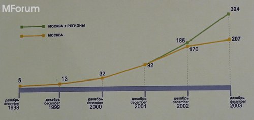 Динамика роста количества салонов связи. Зеленая кривая - Москва + регионы, желтая - Москва.