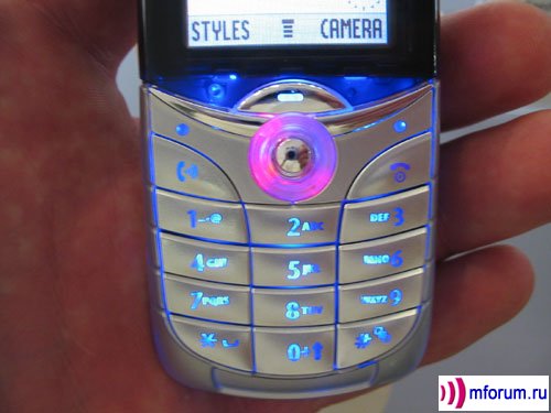 Motorola C650. Клавиатура имеет яркую голубую подсветку, причем джойстик имеет розовый окрас.
