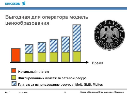 Закономерный вопрос - где здесь экономия для оператора, как, собственно, производятся в такой схеме сотрудничества взаиморасчеты? "Эрикссон" предлагает выгодную модель ценообразования: оператор платит некий начальный платеж (фиксированного размера), а затем выплачивает сумму фиксированного платежа за сетевой ресурс и переменную часть, пропорциональную реальному использованию ресурса (в зависимости от реального трафика). Такая схема, по мнению компании, особенно эффективна на низкодоходных и развивающихся рынках. Схема, где оператор ведет оплату по мере роста числа реальных абонентов, позволяет оператору сэкономить на начальном этапе создания и роста сети, снижая его потребности к начальным инвестициям. Обычно оператор вначале вкладывается в построение сети, а затем начинает набирать абонентов. В предлагаемой схеме, расходы на реализацию начального этапа на себя берет "Эрикссон". Оператор, который за счет этого сэкономил на исходном этапе, затем будет делиться прибылями. Никто не пытается сказать, что это модель, где оператор получит что-то бесплатно. Речь идет о том, что вместо пиковых и не всегда прогнозируемых расходов, расходы оператора становятся планируемыми на годы, речь идет о "размазывании" рисков. |