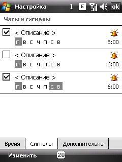 Будильников всего 3; перейти к ним можно из режима "Сегодня". Для каждого настраивается день срабатывания, время, мелодия сигнала и повтор. |