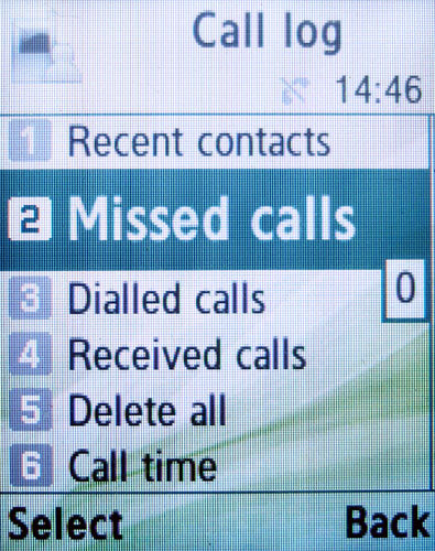Журнал звонков выделен в отдельный пункт главного меню, в нем в соответствующих строка помещены списки последних, пропущенных, набранных и принятых звонков. |