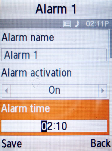 Будильников пять; для каждого указывается время срабатывания, периодичность по дням (хотите - поставьте все, хотите - только будни или выходные), повтор, тип сигнала и мелодия. Можно активировать режим "дремать" ("snooze") и включить автосрабатывание при выключенном телефоне. |