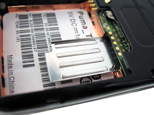 Аппарат поддерживает карты памяти формата miniSD; слот для них находится под задней крышкой смартфона. Он уходит вглубь корпуса; чтобы вытащить карточку, придется снять перед этим батарею, так что "горячая" замена флешки, увы, невозможна.