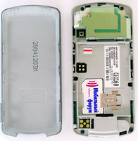 Любопытно, что аккумулятор крепится на пластмассовой защелке, так что о его самопроизвольном покидании места дислокации и речи быть не может. Контакты со стороны телефона сделаны в виде подпружиненных штырьков, хорошо зарекомендовавших себя во многих телефонах, например, Ericsson / Sony Ericsson. Под батареей расположено гнездо крепления SIM-карты, которая также надежно фиксируется на своем рабочем месте.