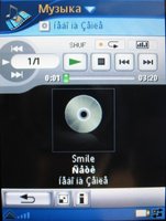 MP3-плеер имеет приличный уровень функциональности. Во-первых, присутствует медиа-библиотека, вещь незаменимая для меломанов. Настроек минимум, но их хватает - перемешивание, повтор, эквалайзер (10 предустановок + "мега-бас"). Во время входящего вызова мелодия прерывается, автоматическое возобновление может быть включено или выключено через настройки. Разумеется, поддерживается фоновый режим, причем на рабочем столе отображается название текущей песни и позиция воспроизведения. Боковой кнопкой можно приостанавливать и возобновлять проигрывание, удерживание ее приведет к запуску или закрытию плеера. Кнопка на гарнитуре также служит для управления воспроизведением. Единственный недостаток, обычный для многих музофонов - отсутствие поддержки русских тегов.