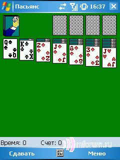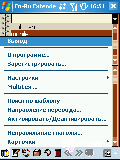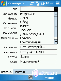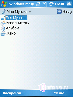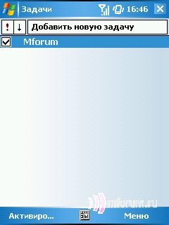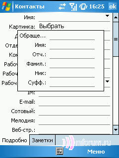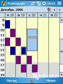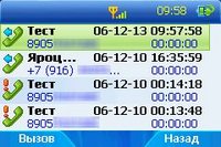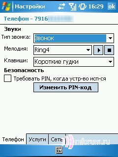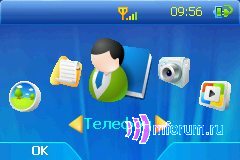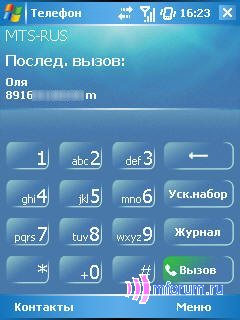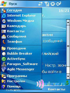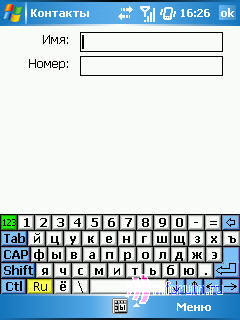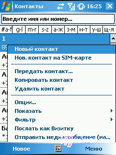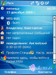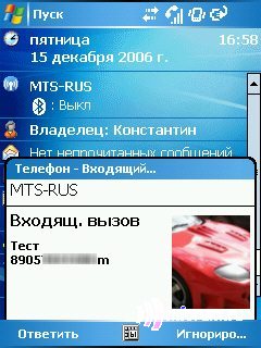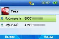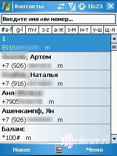 Телефон - приложение для голосовых звонков. При выборе этого пункта открывается телефонная книга, возможности которой ограничиваются поиском нужного абонента, выбора нужного номера телефона и звонка по этому номеру. Особенность - поиск осуществляется традиционным для WinMobile способом, при нажатии на цифровую кнопку выводятся все имена, в которых содержится одна из всех букв, закрепленных за этой кнопкой. То есть, чтобы быстро найти всех, чья фамилия начинается с "Суб", нужно всего лишь нажать последовательно 6, 6, 2. При этом также будут выведены контакты на "Ста", "Тув" и другие комбинации. Надо сказать, что функция несколько урезана по сравнению с обычной версией - нельзя производить поиск по именам, только по фамилиям и номерам телефона.