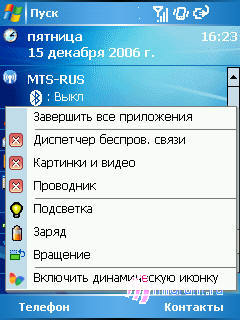 Активный рабочий стол предоставляет большое количество возможностей, например можно включить Bluetooth, зайти в настройки профилей и даже узнать, сколько контактов в ICQ сейчас доступны онлайн. Снизу находится иконка диспетчера задач, он позволяет закрыть работающие приложения. При желании иконку можно сделать динамической - в виде бабочки она будет летать по всему экрану. Многие сторонние программы выводят полезную информацию на рабочий стол, например GPRS-трафик за день и месяц (Smartphone GPRS Traffic Monitor), прогноз погоды (WeatherPanel), время, на которое хватит текущего заряда аккумулятора (Battery Monitor). Есть даже программа, при запуске которой на экране начинает идти снег (PocketSnow) - особенно актуально в нынешнюю зиму.