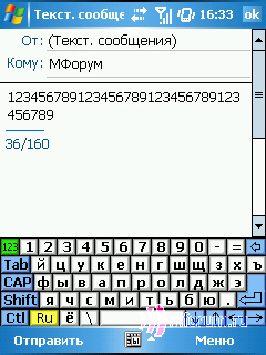 Количество памяти для SMS-сообщений не ограничено конкретной цифрой, а только величиной свободной памяти. Если писать менее 100 сообщений в день, то предела заполнения памяти не достигнуть даже за всю жизнь. Одна строка текста при наборе содержит около 33 символов. Способов набора текста несколько, например стандартный - с помощью виртуальной клавиатуры. Предикативный ввод работает ненавязчиво - предлагает возможные варианты завершения слов в маленьком окошке, при желании можно не обращать на него внимание. Еще один способ - это PenReader, слова пишутся стилусом непосредственно на экране.