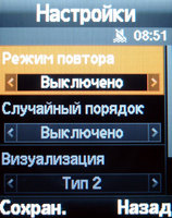 Из настроек отметим возможность создавать свои плей-листы, случайное и повторное воспроизведение и два варианта визуализации. Прямо из меню настроек можно передавать их по Bluetooth, блокировать от случайного удаления и ставить на звонок. Фоновый режим как таковой в Е570 отсутствует: стоит только выйти из плеера, как музыка прекращается. Максимум что возможно - это воспроизведение при закрытом аппарате; на внешнем дисплее в этом случае отображается название текущей композиции. При входящем вызове песня сбрасывается, что, конечно, неприятно: вот-вот должно быть самое любимое место в песне, а тут бац - и звонок!