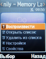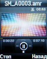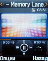 МР3-плеер запускается либо из меню "Приложения", либо "быстрой" функцией. Интерфейс его выглядит вполне традиционно для "самсунгов": в верхней строке - название композиции, под ней - текущее время, потом - цветовая визуализация на пол-экрана, под которой помещены шкала длительности (со счетчиком времени и указанием общей продолжительности выбранной песни) и графическое управление. С ним все просто: горизонтальными позициями "навигационки" осуществляется перемотка, верхняя позиция открывает текущий список воспроизведения, нижняя останавливает музыку. Кнопка "ОК" работает как "Play/Pause". Качество звучания субъективно очень хорошее, как в наушниках, так и на спикерфоне. Нас особенно порадовала хорошая передача низких частот; что касается громкости, то она регулируется "боковой" качелькой по 14 уровням и запас ее вполне неплохой.