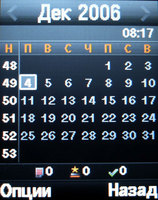 Календарь выделен в отдельный пункт главного меню. Он позволяет просматривать события за день и за неделю, а также вводить новые по трем категориям: встречи, годовщины и задачи (до 100 событий каждого типа). Есть переход к нужной дате, на текущий день и к списку дел. Кроме того, в отдельный список выделены пропущенные события. В меню "Опции" самая нижняя строка - проверка состояния памяти.