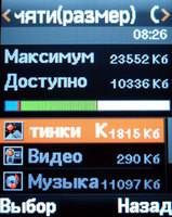 Производитель заявляет о 20 Мб встроенной пользовательской памяти, но файл-менеджер дает несколько другие цифры - 23,5 Мб. Расхождение в пользу потребителя, так что претензий производителю предъявлять не будем. Память расходуется динамически; ее можно увеличить за счет карты памяти, для которой к тому же допустима и "горячая" замена. Вот только в базовый комплект карту не положили - очень жаль.
