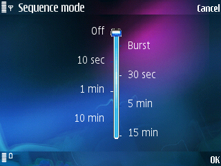 Зато у N95 есть то, чего нет у Сайбершотов - это по сути та же мультисъемка, но с длительным интервалом фиксации кадра - 10, 30 секунд, минута, 5, 10 и 15 минут. Например, спрятали вы в укромное место смартфон, запустили автосъемку с интервалом 15 минут, а в конце дня посмотрели, что же происходило в комнате - перед вами будут снимки каждой четверти часа. Но надо помнить, что и здесь снимки складываются в оперативную память, поэтому для них тоже должно быть свободное место. Жаль, что нет опции автоматического сохранения.