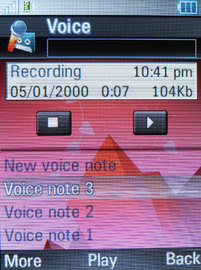 Для диктофона используется динамическая память; при записи в верхней строке отображается динамический индикатор записи, ниже - счетчик времени, а внизу экрана - список записей. Доступна и запись телефонных разговоров, но диктофон для этого придется активировать только из меню: специальной команды на запись разговора нет.