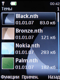 Доступны 4 варианта отображения главного меню: список (4 пункта на экране), значки (сетка из 10 элементов), значки с подписью (9 элементов, остальные - при помощи вертикальной прокрутки), вкладки (основное меню в верхней строке, переход по пунктам - горизонтальной прокруткой; подменю - снизу, с вертикальной прокруткой). Все подпункты выглядят в виде списков. При навигации левая софт-кнопка отвечает за вызов меню "Функции", а правая - за возврат на пункт выше. Выход в режим ожидания происходит кнопкой сброса. Софт-кнопки и стрелки "навигационки" программируются на "быстрые" функции в меню "Настройки" - "Быстрый доступ". Темы: Black, Bronze, Nokia, Palm, Silver, Waves.