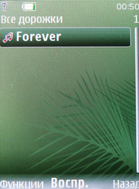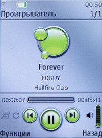 Интерфейс плеера довольно необычный: в верхней половине экрана - название песни, под которым располагается имя исполнителя и альбом (плюс картинка-визуализация, если она есть), тогда как вся нижняя половина экрана предназначена для настроек и управления. Сначала идет шкала времени со счетчиками, ниже слева - значки настроек, правее - графическое управление, а еще правее - шкала громкости, которая регулируется клавишей-"качелькой". Горизонтальные стрелки навигационной кнопки служат для перемотки (в пределах песни она нарастающая), а кнопка "ОК" - для остановки/возобновления звучания. Нажав верхнюю стрелку, вы перейдете в библиотеку, а нижнюю - в текущий плей-лист.