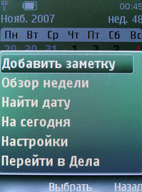 Календарь реализован стандартно, он позволяет вводить новые заметки (напоминания, встречи, вызовы, дни рождения и просто заметки), просматривать события за день и за неделю, переходить к текущей дате и к списку дел, найти нужную дату, а также настроить само представление календаря (с какого дня начинать неделю и т.д.).