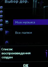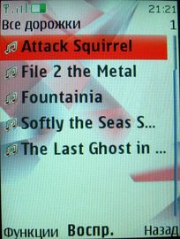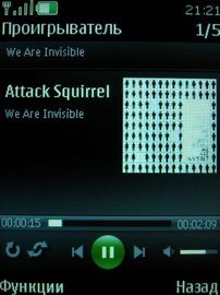 При запуске проигрывателя мы попадаем в медиа-библиотеку, где песни рассортированы по исполнителям, альбомам и жанрам, а также есть списки всех дорожек, плейлистов и видеоклипов. Помимо пользовательских плейлистов есть также списки последних добавленных и воспроизведенных композиций, а также наиболее часто прослушиваемых. Во время проигрывания отображается следующая информация: имя исполнителя, альбом и название песни, обложка альбома (если есть), прошедшее и полное время песни, режим воспроизведения (случайное и повтор), уровень громкости. Отклонениями джойстика влево/вправо переключаемся между треками, вверх - попадаем в медиатеку, вниз - в текущий плейлист. Поддерживаются различные скины: помимо стандартной оболочки установлено еще 4 темы. Настройки звука включают в себя эффективный эквалайзер (предустановки + настраиваемый 5-полосный) и расширение стерео. Проводная стереогарнитура из базового комплекта среднего качества, на ней нет ни пульта управления плеером, ни возможности подключения собственных наушников. Поддерживается фоновое воспроизведение, причем название песни отображается на рабочем столе независимо от того, установлен ли активный режим ожидания.