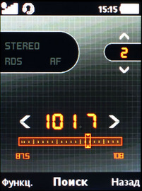 Интерфейс радио прост и понятен. Включается оно абсолютно так же, как и плеер. Есть поддержка RDS. В памяти можно сохранять до 20 радиостанций; в качестве антенны стандартно выступает шнур наушников, так что не пытайтесь включить радио при неподключенной гарнитуре. Отметим также автопоиск, возможность произвольно ввести частоту или вывести радио на спикерфон, а также оставить его в фоновом режиме. Перемещение по диапазону осуществляется горизонтальными стрелками навигационной кнопки с шагом 0,1 мГц.