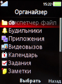Объем встроенной памяти составляет 36 Мб, распределяемых динамически. Состояние памяти можно просмотреть в меню "Диспетчер файлов", который разработчики почему-то запихнули не куда-нибудь, а в меню "Органайзер".
