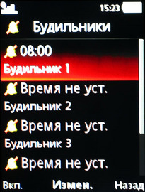 Будильников 5; для каждого указывается время, мелодия, повтор сигнала и текстовая заметка. Можно настроить будильник на каждый день, только на выходные или только на будние дни.