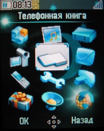 Телефонная книга позволяет сохранять до 800 контактов плюс еще 250 - на SIM-карте. Для каждого из них записывается имя абонента, мобильный, домашний и рабочий номера, название компании, е-mail, факс, день рождения. Картинку, мелодию и даже видеоролик можно присвоить как отдельному абоненту, так и группе. Предустановленных групп две - "Личная" и "Работа", но можно создавать свои собственные. Справочник разделен горизонтальными закладками на 4 части: память SIM-карты, память телефона, группы и общая книжка - в ней одновременно отображаются элементы из всех предыдущих категорий.