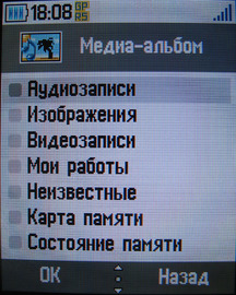 Объем встроенной памяти составляет 10 Мб, распределяемых динамически. Состояние памяти можно посмотреть в меню "Инструменты" или "Медиа-Альбом".