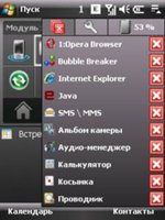 Во вкладке с часто используемыми (по мнению разработчиков) приложениями находятся электронная почта, SMS/MMS, Internet Explorer, задачи, Comm Manager, календарь. Заменить эти программы на свои любимые нельзя. В мультимедийной вкладке те же самые кнопки: музыка, фото и видео. Первая кнопка служит для запуска проигрывателя, причем не стандартного WindowsMedia, а фирменного "Аудио-менеджера". Интерфейс его вполне позволяет спокойно работать пальцами. Поддерживается и интеграция в оболочку - при работе проигрывателя между кнопками "Музыка" и "Фото" появляются элементы управления воспроизведением - кнопки паузы, перехода на предыдущий и следующий треки, полоска с текущим положением воспроизведения с возможностью моментально изменить его, название исполнителя и песни, оставшееся до конца песни время.