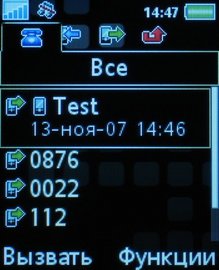 Меню "Вызовы" представляет собой реализованные в виде горизонтальных закладок списки: общий, принятые, исходящие и непринятые вызовы. Специальными значками отмечается статус звонка (входящий, исходящий, непринятый). Указывается дата и время звонка. Во время разговора в правом нижнем углу дисплея отображается счетчик времени.