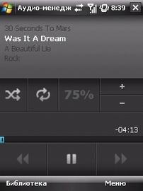 Медиаплеер можно запустить с рабочего стола; при запуске открывается библиотека с закладками для музыки, видео, записей ТВ-передач и списков воспроизведения. Музыка сортируется по исполнителям, альбомам и жанрам, видео – только по жанрам. Библиотеку в любой момент можно обновить – достаточно выбрать в меню соответствующую команду. Интерфейс плеера не претерпел никких изменений; слева вверху - название песни, справа – рейтинг, а внизу – шкала длительности и графическое управление. Есть случайное и повторное воспроизведение, а также фоновый режим. Впрочем, по желанию можно прервать воспроизведение на время работы с другим приложением. Кириллические теги аппарат воспринимает без проблем, так что русские названия песен отображаются вполне корректно. Запас по громкости хороший, здесь никаких проблем, а "родные" наушники обеспечивают вполне приемлемое качество звучания. На спикерфоне звук, естественно, проигрывает, но благодаря двум динамикам и здесь достигается неплохое качество воспроизведения. При входящем звонке по умолчанию песня встает на паузу, а потом продолжает играть с прерванного места. При желании это можно отключить, тогда придется возобновлять работу плеера вручную. Видео может воспроизводиться в полноэкранном режиме, на качестве это не сказывается. Фирменный "Аудио-менеджер" от HTC по возможностям не уступает встроенному WindowsMedia: здесь есть и медиа-библиотека, и поддержка смешанного воспроизведения. Из преимуществ - интерфейс с крупными кнопками, которые легко нажимаются пальцами. Еще одна интересная возможность - установка мелодий в качестве рингтонов, причем из песни можно вырезать нужный фрагмент, например - только припев. Впрочем, есть и недостатки - отсутствие эквалайзера и возможности переназначения клавиш. Если это жизненно важно, то придется, к сожалению, искать сторонний плеер.