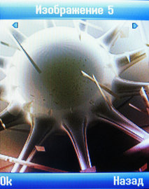 Дисплей ничем не поражает, он вполне традиционный для аппаратов среднего ценового сегмента. Разрешение его - 176x220 точек; если приглядеться - можно увидеть зерно. Он способен передавать до 65536 цветов. Для оформления интерфейса доступны 3 темы, фоновые рисунки, анимированные заставки, приветствие. В меню "Настройки" можно отрегулировать время (до 1 минуты с шагом в секунду) и контрастность (точнее, яркость по 5 уровням) дисплея. При входящем вызове дисплей умеет выводить изображение звонящего, но здесь все не так просто: когда мы захотели поставить на контакт снимок с камеры размером 640х480 точек, это оказалось слишком много для телефона, о чем тот и предупредил уведомлением о слишком большом размере файла.