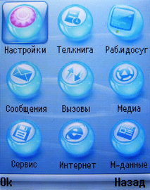 Меню телефона представлено матрицей 3х3. Иконки крупные, хорошо воспринимаемые. Можно изменять цветовую схему меню, а также сделать это изменение автоматическим с определенным интервалом (от раза в час до раза в квартал). Темы изменяют только вид меню. Заставка на рабочий стол меняется отдельно. Имеется меню "Избранное" (состав легко изменить в настройках), аналогичное меню "Актив" в аппаратах Nokia.