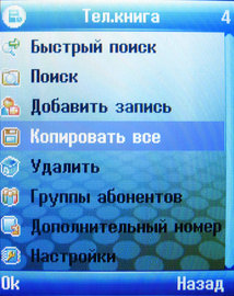 В справочнике имеется 6 абонентских групп. Поддерживается голосовое дублирование набора номера и номера входящего звонка. Из опций отметим быстрый поиск, обычный поиск, создание копии адресной книги, удаление справочника, создание визитной карточки, настройку групп (друзья, семья, VIP, бизнес, другие). При вводе нового контакта указывается имя, до 3 номеров, компания, адрес эл.почты, факс, картинка и рингтон, а также текстовая заметка. Группам также можно присвоить свои рингтоны и картинки. Объем памяти можно посмотреть в настройках: 1000 ячеек в телефоне и 250 – для симки.